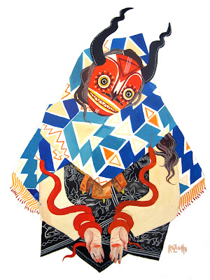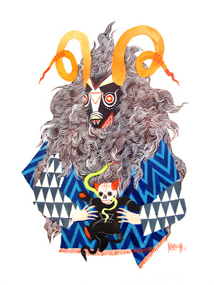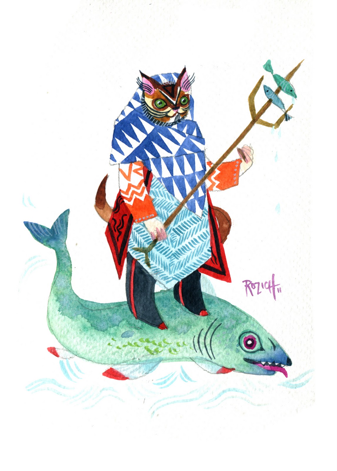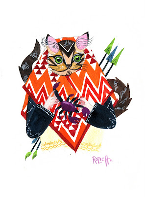 We chatted over e-mail about incorporating her new (adorable) cat Marlo into my style for a commission. Usually I dread personalizing my artwork with another person's ideas, but this time I was really excited for realizing Marlo as a folk character in striking New Mexican textile inspired garments. I created a little narrative of Marlo as a fisherman (Ada says he's big into water and suspects him as a fisherman in a past life) and a portrait of Marlo as a shamanic figure holding a scorpion (another nod to the Southwest).